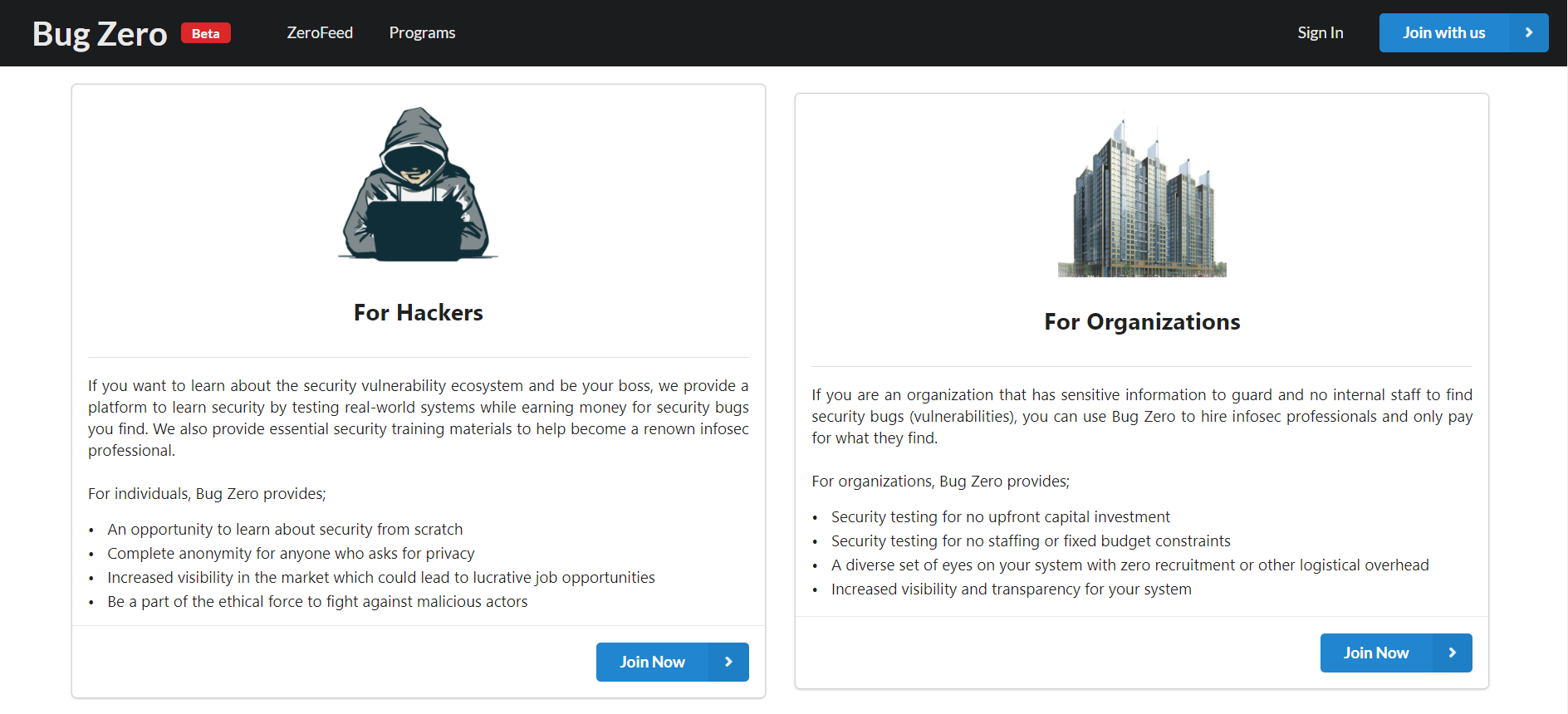 BugZero is a fully managed crowd powered bug bounty platforms. Bug Zero platform provides security testing services to the organizations with no upfront costs. With Bug Zero